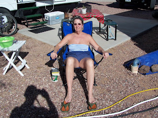 ...You can see the campground in the distance, so he still hadn't succeeded in losing me in the desert..I know you wonder why he may want to pretend he doesn't know me. But, you haven't seen my alternative "uniform" I use for sunbathing..