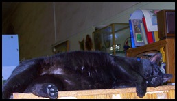 Above is the Jefferson Memorial Park, with a bust of the President, a fountain, gas lights and benches to sit…It goes from one street clear through to the other. We strolled leisurely up and down the streets. There is a ton of things to do here…Boat trips down the Big Cypress Bayou, home tours, museums, restaurants, art studios, over 40 bed and breakfasts , 2 historic hotels and many antique shops. We strolled into one of the antique shops and found this lovely lady lounging about on a shelf…She exhibits the calm serene aura of Jefferson, she didn’t even open her eyes to check us out..and, yes, she is a real cat.