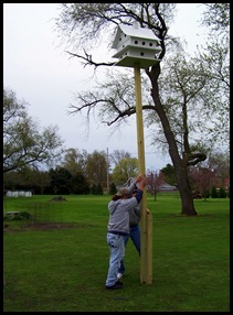 This sucker weighs 50 lbs, and I just KNEW that not only was I not strong enough, but I wasn’t tall enough to be of any help at all!!! It is pretty neat, eh?? The Martins have all these rules about their homes…They cannot be very near any trees, they have to be within a certain height…Next thing you know they will want us to repaint and carpet!! That’s when we will raise their rent!…Funny thing though..Just after the house went up, we spotted some Martins zooming around overhead…checking out the neighborhood..I hope they decide to move in or we will end up with those darn Starlings…and there goes the neighborhood!
