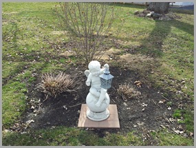 Got the patio table and chairs up and ready…the firepit is now on our driveway (we don’t have a real patio)…and our cherub is waiting for some sunshine to charge the solar light he is holding…His arm could get real tired!
