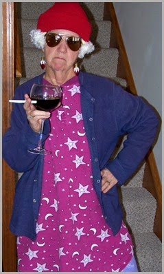 Got my “Santa” on!! (along with Tweety pants, Maxine nightshirt, camo crocks and fabulous stripe socks…) The people next door are getting an eyefull…and this place will never let us come back here if they catch this blog and the REAL me!!! )